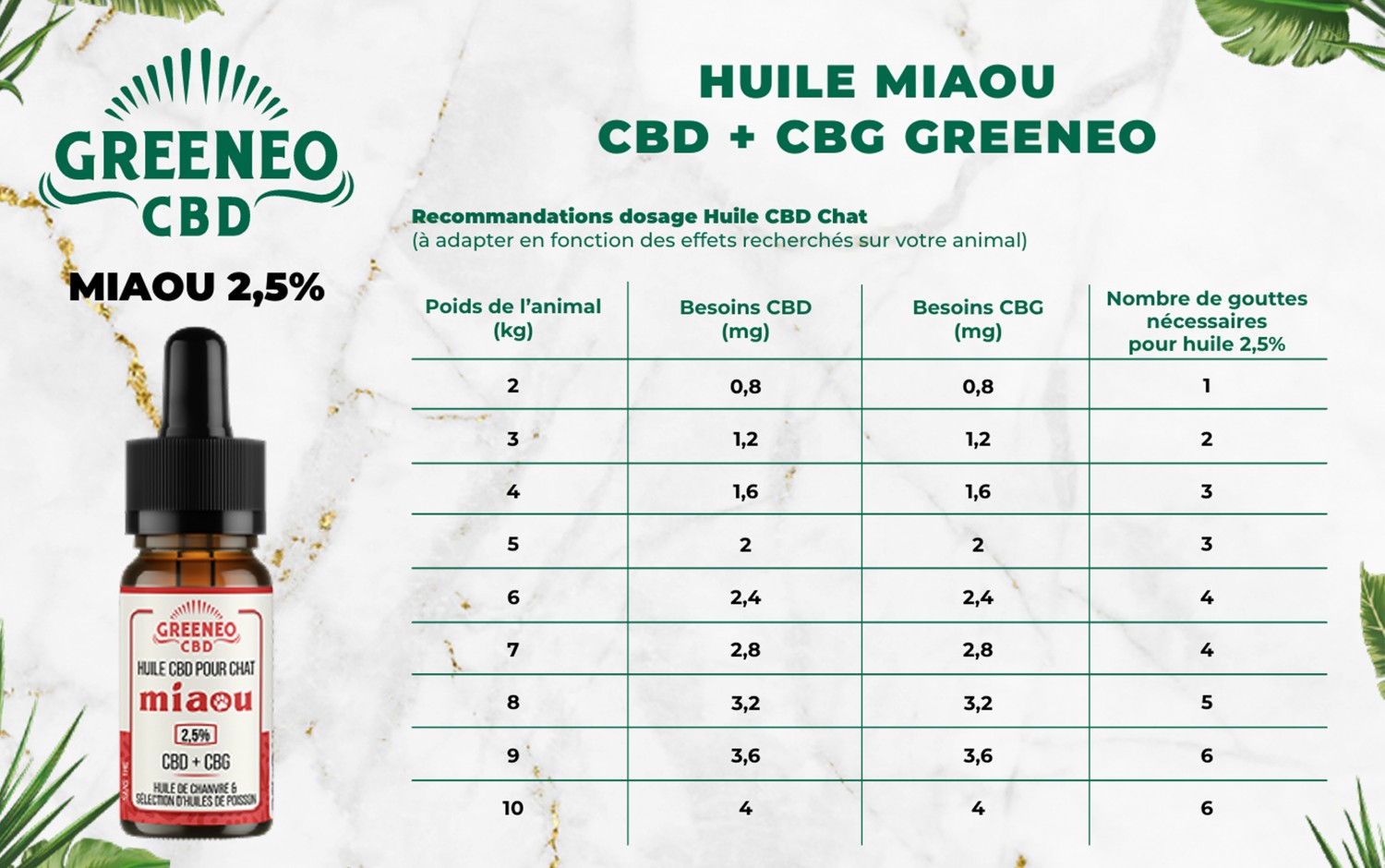 Quand un chat ne va pas bien, on le sent tout de suite : comportement inhabituel, miaulements répétitifs, agitation, ou au contraire, perte d'appétit, sommeil excessif, raideurs… Pour les apaiser, on cherche des solutions simples, douces, et surtout fiables pour l'aider à retrouver son équilibre. L'huile CBD + CBG 2,5% pour chat de Greeneo a été pensée dans ce sens : offrir à votre animal un soutien naturel, bien dosé et sans aucun risque.